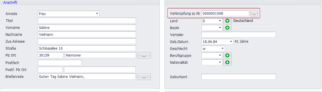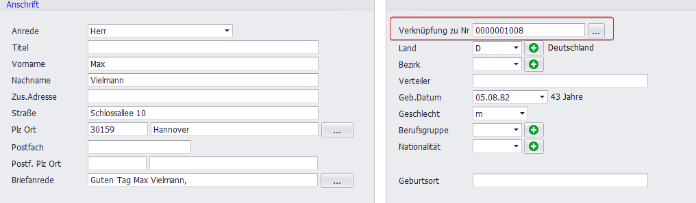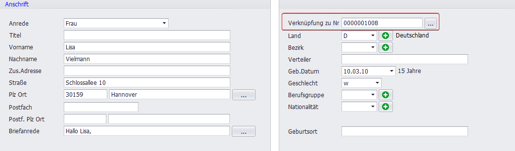 Zur Verknüpfung wird das Hauptmitglied (z. B. Vater) ausgewählt und dessen Nummer auch als Verknüpfung eingetragen. Weitere Familienmitglieder werden separat geöffnet und ebenfalls mit dieser Nummer als Verknüpfung versehen. Somit sind alle Mitglieder des Familienverbunds logisch verbunden.
