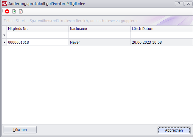 Im Protokoll gelöschter Mitglieder werden folgende Informationen dokumentiert: