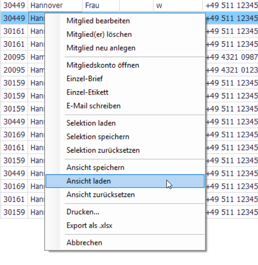 Klicken Sie dazu in der Mitglieder-Übersicht mit der rechten Maustaste auf "Ansicht laden".