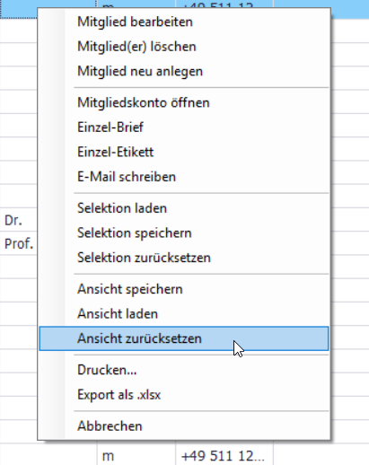 Klicken Sie dazu in der Mitglieder-Übersicht mit der rechten Maustaste auf "Ansicht zurücksetzen".