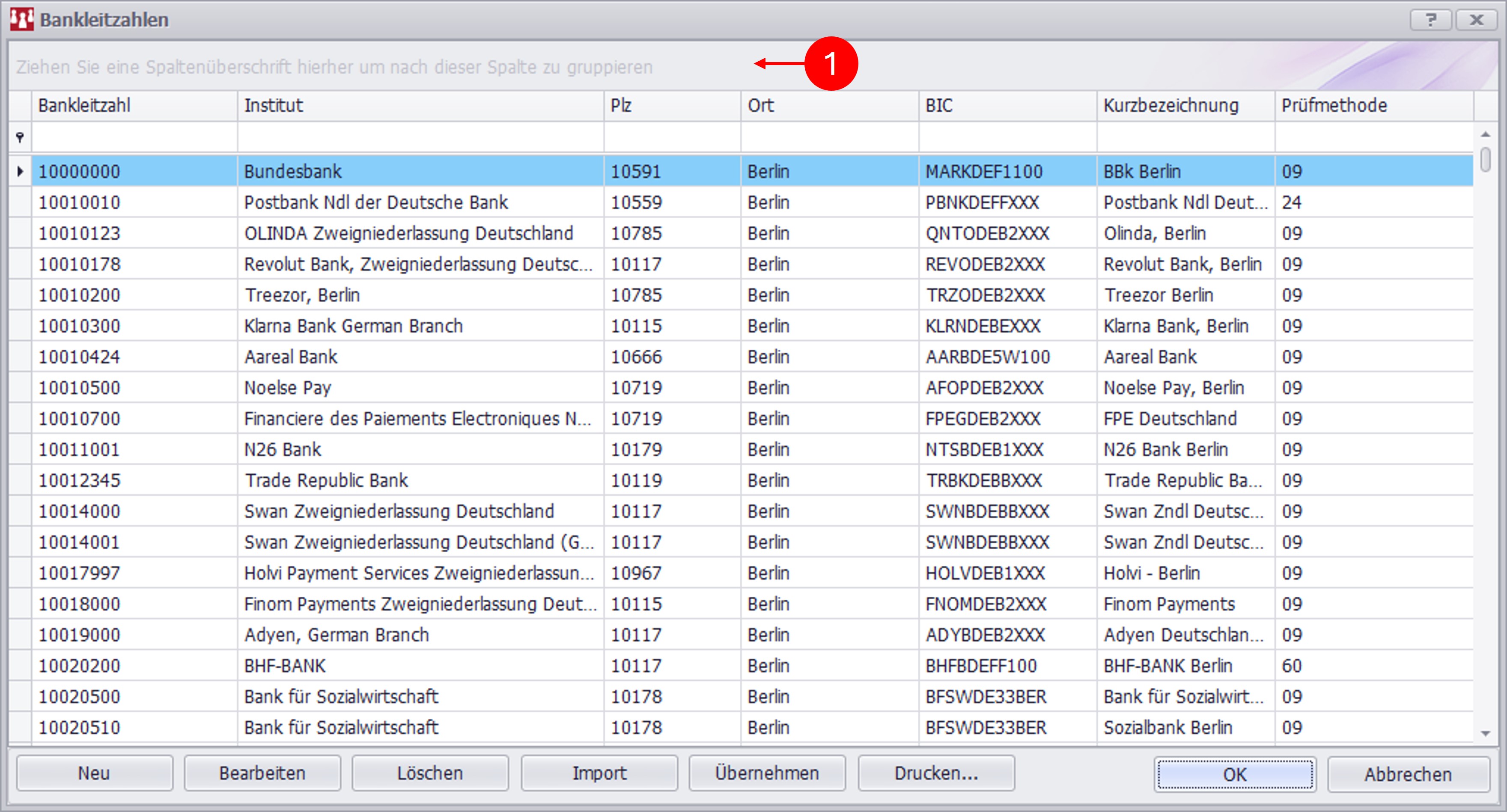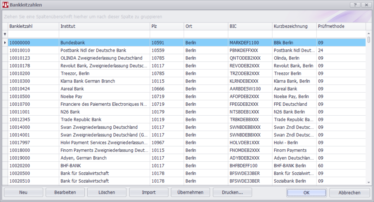 Menüleiste: Stammdaten > Bankleitzahlen