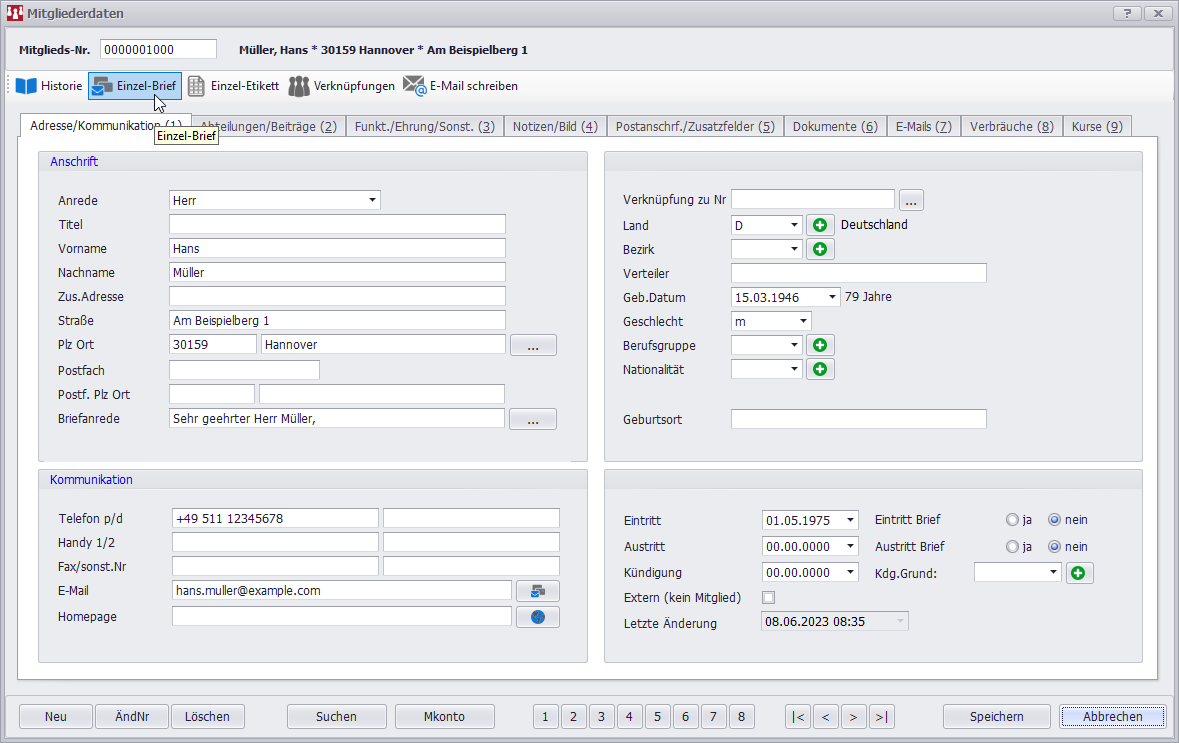 Rufen Sie ein beliebiges Vereinsmitglied auf und gehen auf den Button Einzel-Brief: