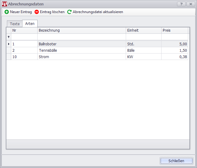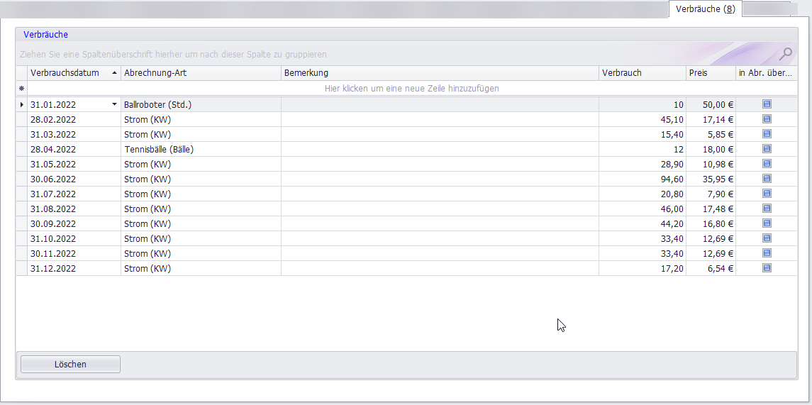 In dieser Ansicht sehen Sie alle erfassten Posten mit Datum, Art, Menge und dem daraus resultierenden Preis. In der Spalte "Abrechnung-Art" können Sie aus den zuvor von Ihnen definierten Arten auswählen (im Beispiel "Ballroboter", "Tennisbälle", "Strom").