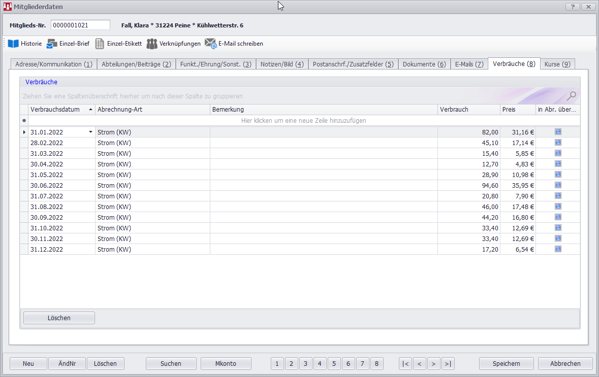 Die Erfassung der Verbräuche findet direkt in den Mitgliederdaten statt.