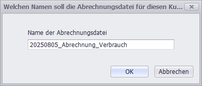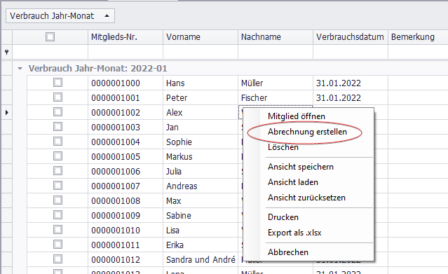 - 2. Abrechnung erstellen: Klicken Sie mit der rechten Maustaste auf Ihre Auswahl, um das Kontextmenü zu öffnen. Menüpunkt: Abrechnung erstellen. Vergeben Sie anschließend einen Namen für die Abrechnungsdatei.