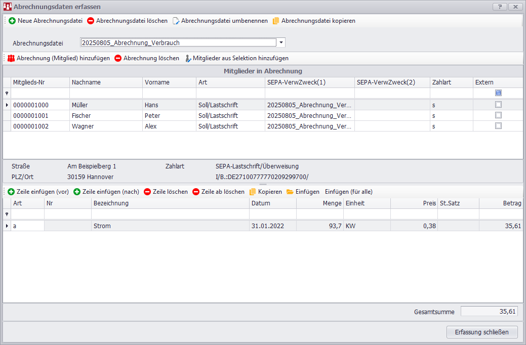 Die eigentliche Abrechnung (z. B. die Erstellung einer SEPA-Datei) führen Sie anschließend wie gewohnt im Abrechnungsverfahren durch. Weiteres zum Thema Abrechnungsverfahren erhalten Sie im Kapitel: Abrechnungsverfahren
