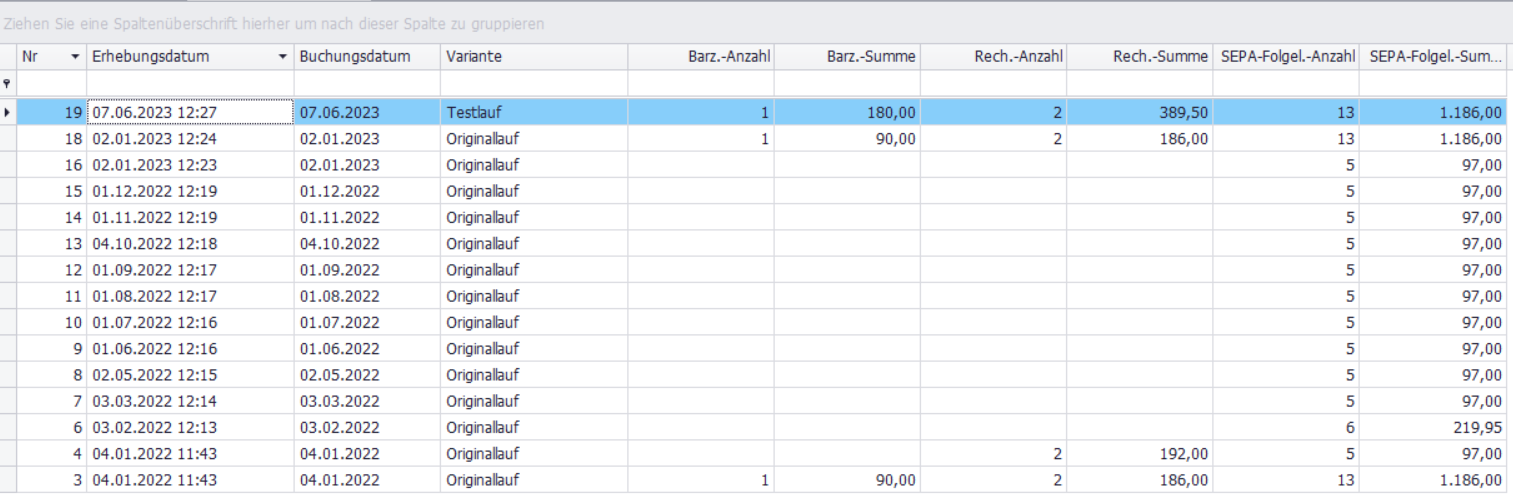 Zur besseren Übersichtlichkeit sind alle Einträge in einer tabellarischen Ansicht angeordnet. Sie sehen zu jeder Beitragserhebung relevante Details, wie beispielsweise das Durchführungsdatum, den Status und gegebenenfalls weitere Kennzeichen.