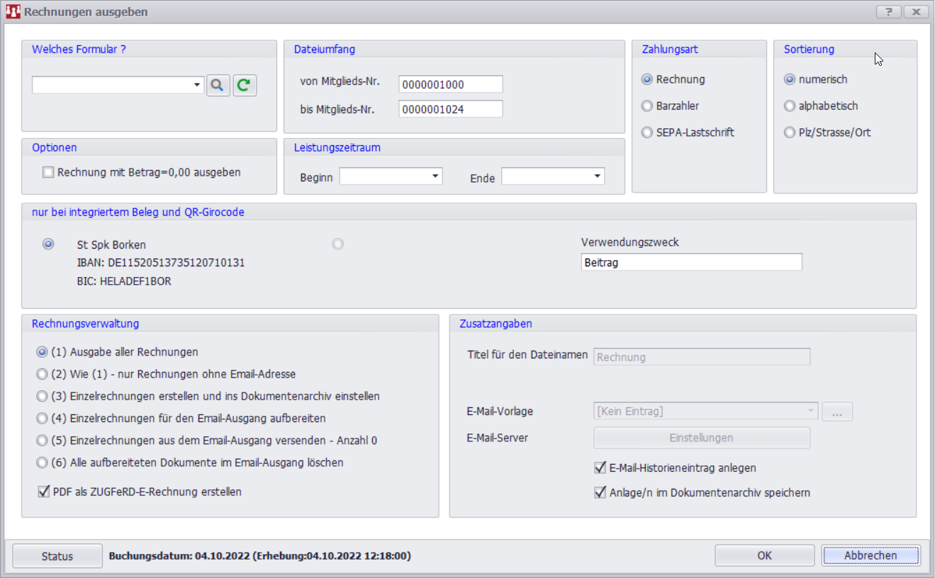 Über die Funktion Rechnungen ausgeben können Sie auf Basis der gewählten Beitragserhebung direkt Rechnungen für die betreffenden Mitglieder erzeugen. Diese Funktion ist vor allem für Mitglieder relevant, deren Beiträge nicht per Lastschrift, sondern per Überweisung oder Barzahlung beglichen werden. Die erstellten Rechnungen können anschließend ausgedruckt oder per E-Mail versendet werden, je nach Konfiguration und Bedarf.