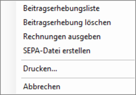 Durch einen Rechtsklick auf eine Beitragserhebung öffnet sich das sogenannte Kontextmenü. Dieses ermöglicht den direkten Zugriff auf verschiedene Aktionen, die im Zusammenhang mit einer Beitragserhebung zur Verfügung stehen. Die Auswahl erfolgt immer durch einfaches Anklicken des gewünschten Menüpunktes.