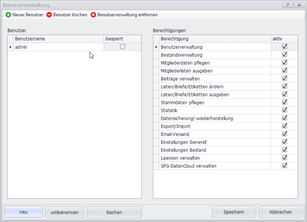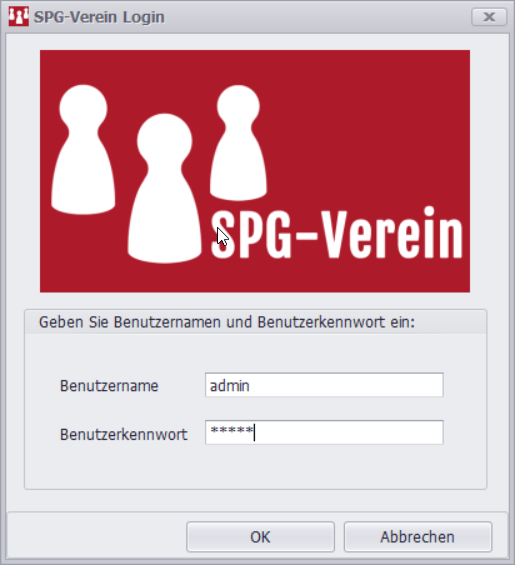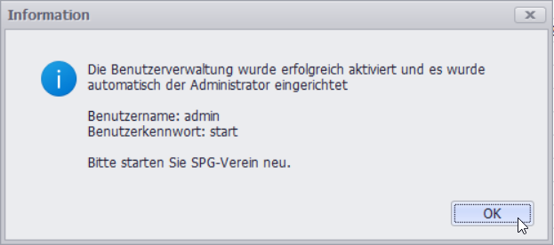 Nach Aktivierung der Benutzerverwaltung wird automatisch der folgende Benutzer angelegt, der innerhalb von SPG-Verein als Administrator eingerichtet wird: