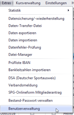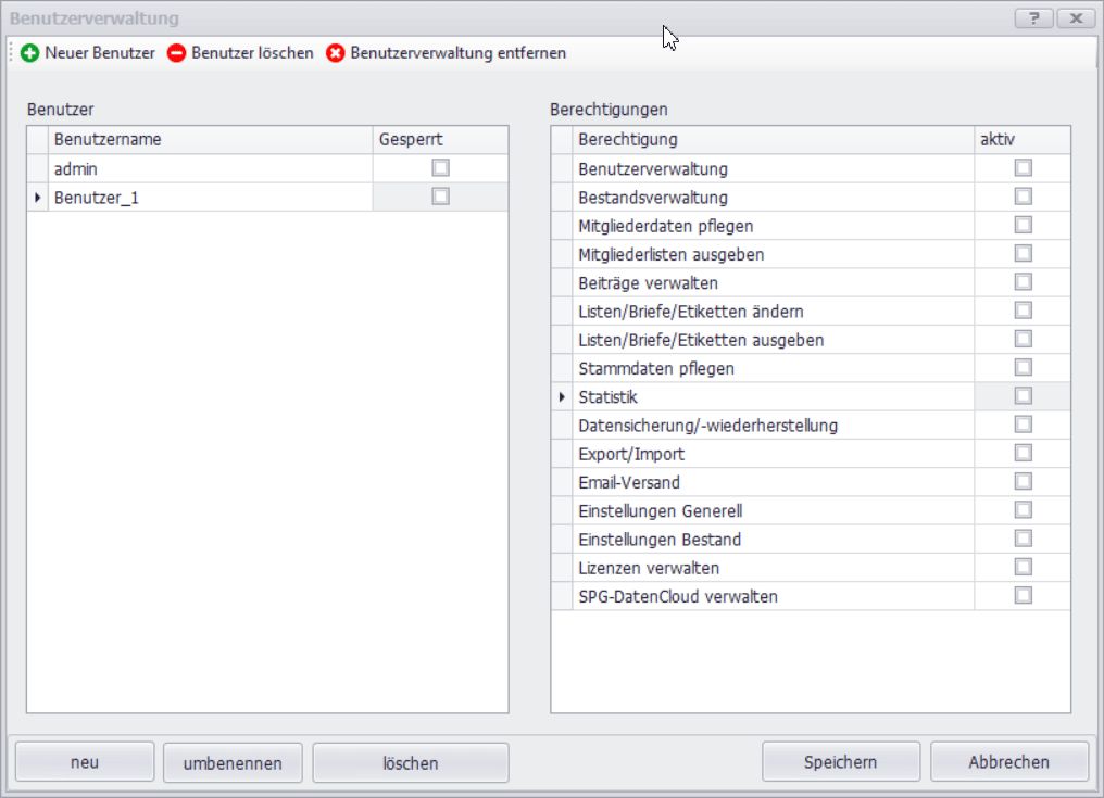 Durch die Benutzerverwaltung haben Sie die Möglichkeit, verschiedenen Benutzer anzulegen, zu löschen und unterschiedliche Berechtigungen innerhalb von SPG-Verein zuzuweisen. Dadurch können Sie bestimmte Programmfunktionen bestimmten Personen (z.B. Kassenwart, Vorstand) individuell zuordnen.