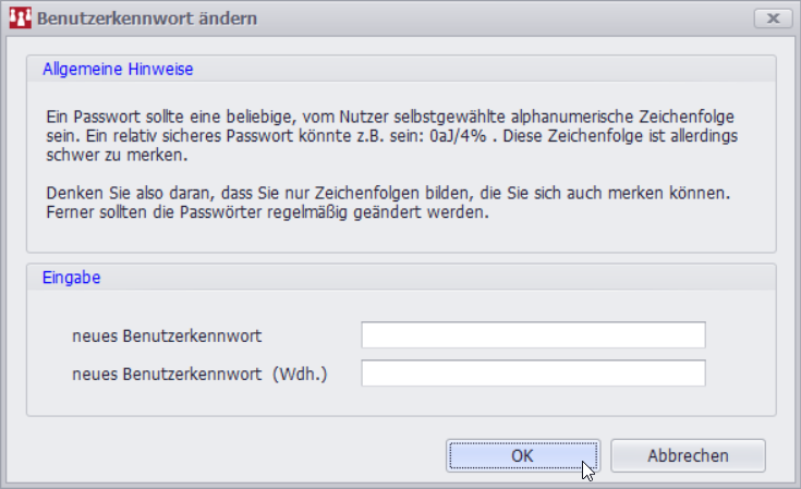 Das Kennwort für den angemeldeten Benutzer kann über Menüleiste: Extras > Benutzerkennwort ändern neu vergeben werden.