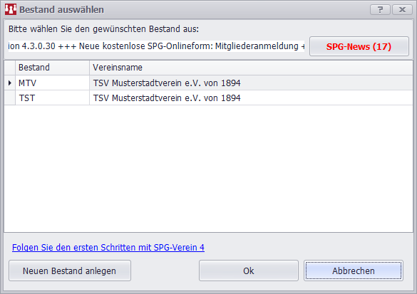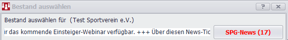 Im Fenster zur Bestandsauswahl ist ein Newsticker integriert. Dieser informiert Sie automatisch, wenn es Neuigkeiten zu SPG-Verein auf der Internetseite www.spg-direkt.de gibt.