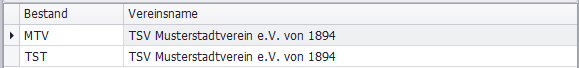 In der Auswahlliste werden alle bereits angelegten Vereinsmandanten angezeigt. Zu jedem Bestand sehen Sie das Vereinskennzeichen (zum Beispiel TST) und die vollständige Vereinsbezeichnung.