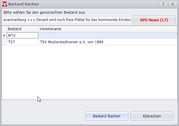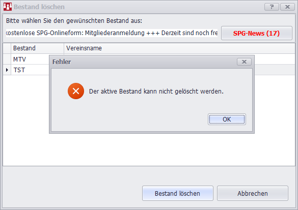 Um zum Beispiel den Testbestand zu löschen, müssen Sie vorher einen anderen Bestand auswählen.