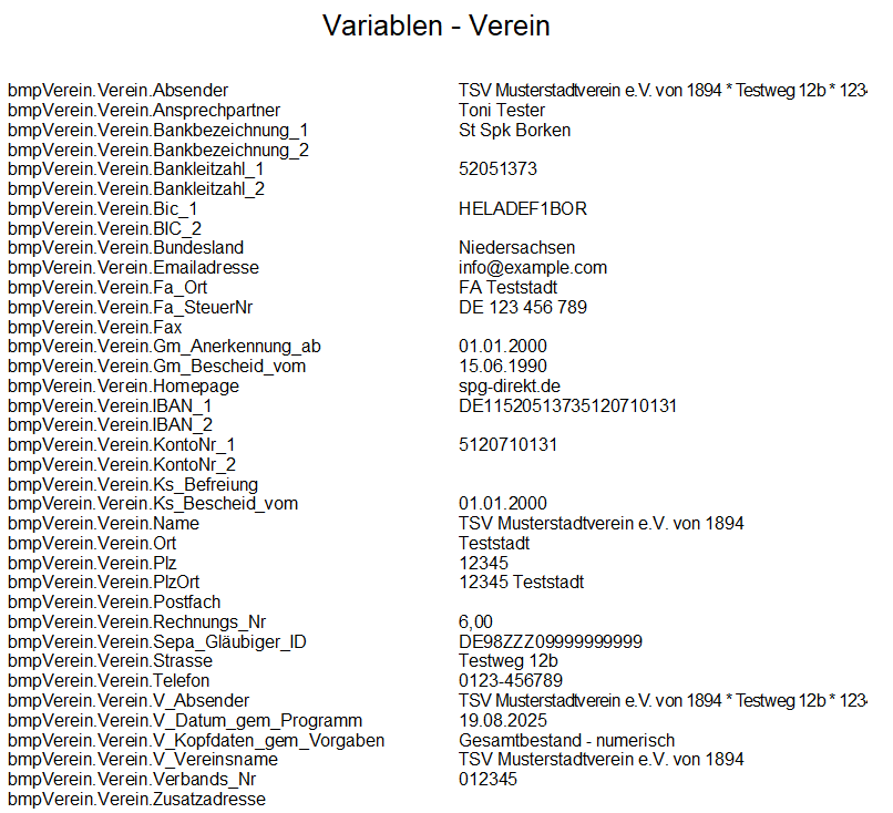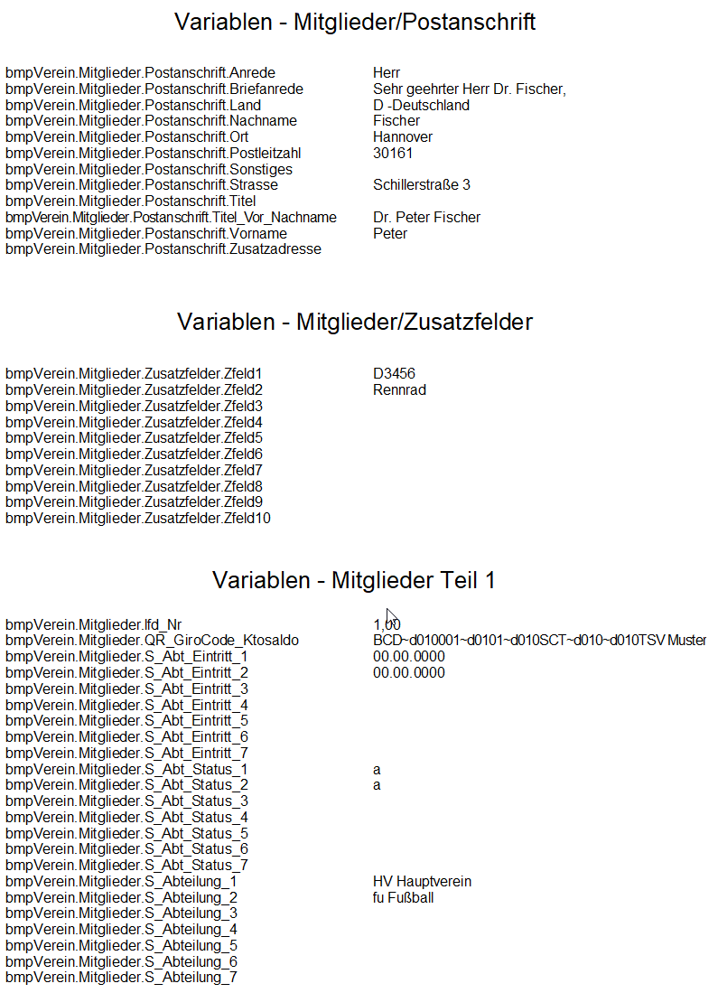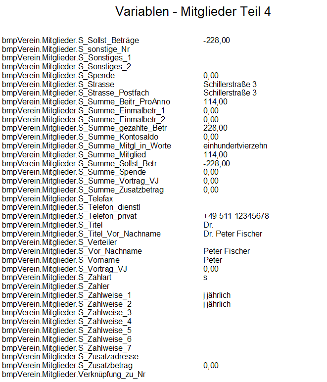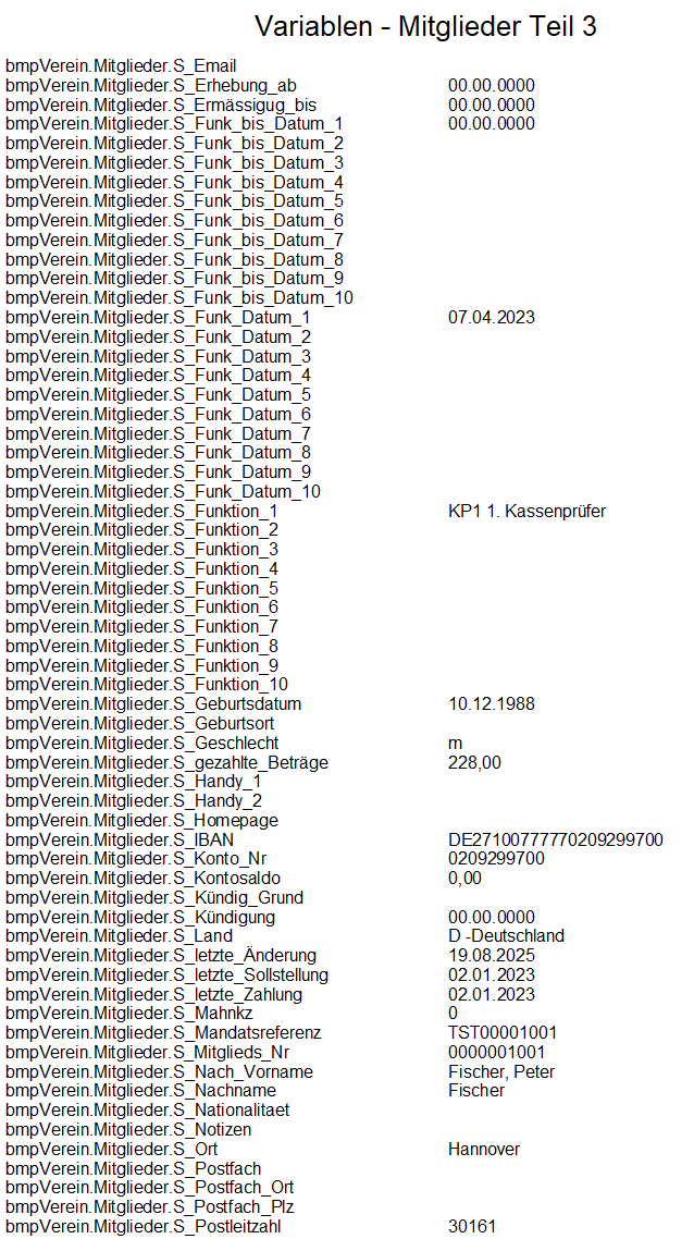 In dieser 5-seitigen Vorlage, kann man eine Auflistung aller Felder sehen, die in Briefen und Listen zur Verfügung stehen.