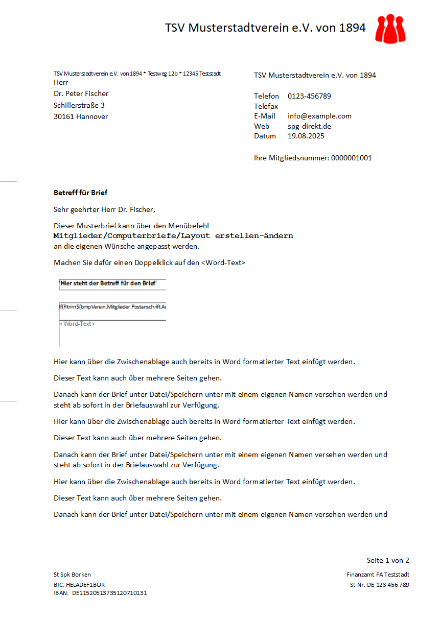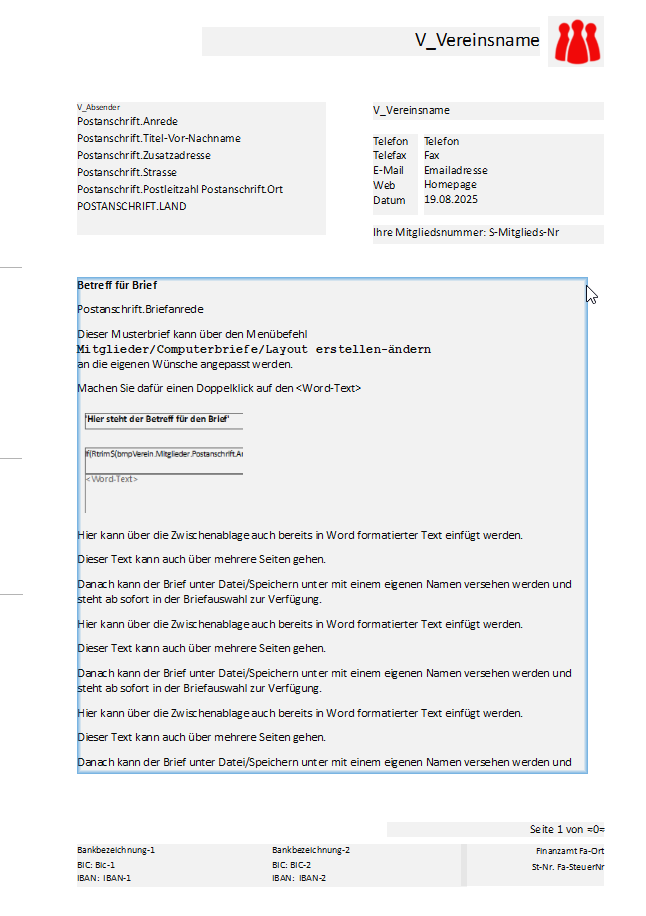 Der Musterbrief ist mehrseitig und nutzt dazu das Steuerelement „Formatierter Text“.