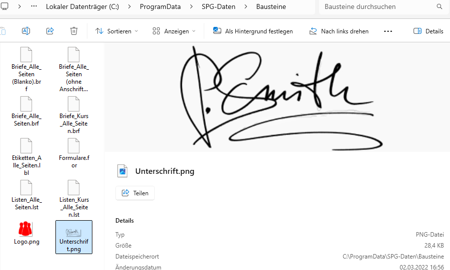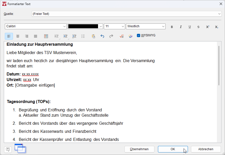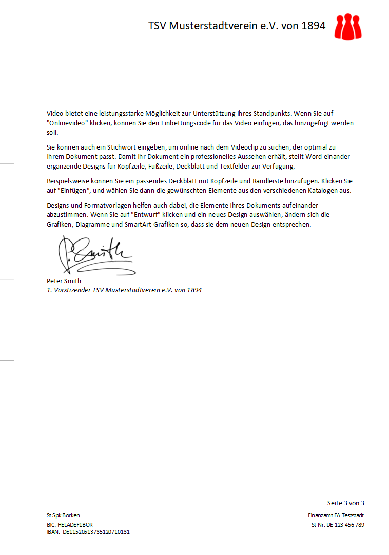 Diese Vorlage funktioniert genau wie die zuvor beschriebene Vorlage. Allerdings mit einer Besonderheit: Wenn im Ordner \Bausteine ein Bild Unterschrift.png existiert, wird dies automatisch am Ende des formatierten Textes mit eingebaut, ansonsten bleibt der Platz frei für die echte Unterschrift.
