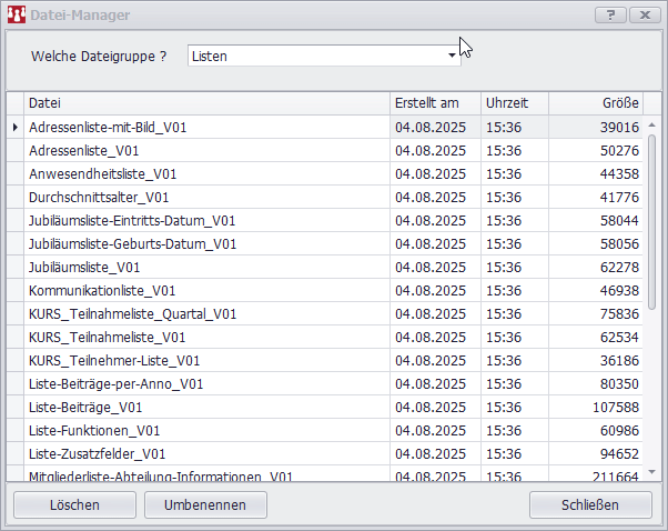 Über den Dateimanager haben Sie die Möglichkeit an einem zentralen Ort Listen, Etiketten Mahnungen/Rechnungen/Abrechnungen/Zuwendungen und Briefe zu organisieren.
