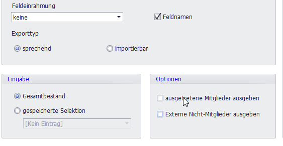 Unter Optionen legen Sie fest, ob auch ausgetretene und externe Mitglieder in dem Export enthalten sein sollen.