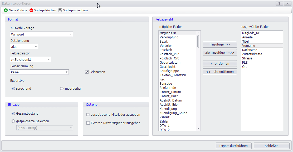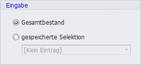 Über Eingabe können Sie Einstellungen vornehmen, ob der Gesamtbestand oder eine gespeicherte Selektion als Datenbasis für den Export verwendet werden soll.