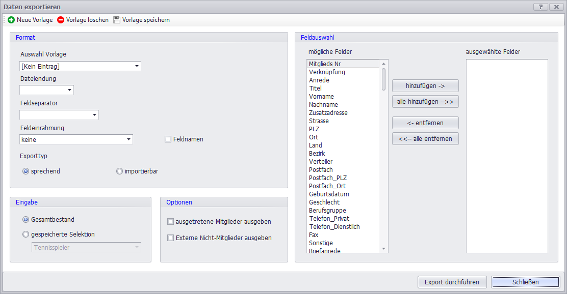 Definieren Sie hier eine Exportvorlage. Folgende Vorlagen stehen Ihnen zur Verfügung: