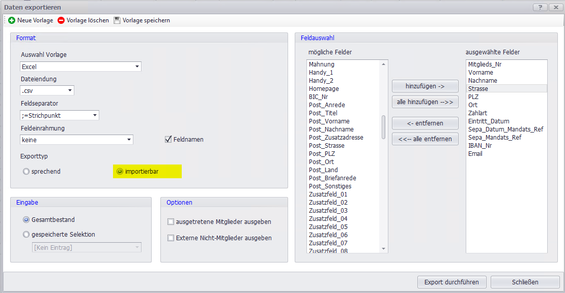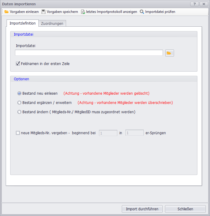 Bestand neu einlesen | Wenn diese Option gewählt wird und der Vorgang gestartet wird, werden alle bisherigen Mitglieder aus dem aktuellen Bestand entfernt und vollständig durch die neuen, einzulesenden Mitgliederdaten ersetzt. |