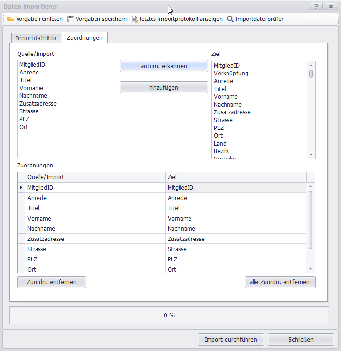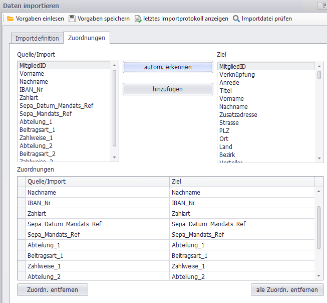Im Reiter Zuordnungen können Sie die Beziehungen von den Daten in SPG-Verein und den zu importierenden Werten herstellen.