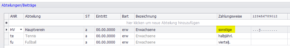 Soll eine abweichende Zahlweise genutzt werden, zum Beispiel, dass der Jahresbeitrag immer im April eingezogen wird, geben Sie dies über die Zahlweise "sonstige" an.