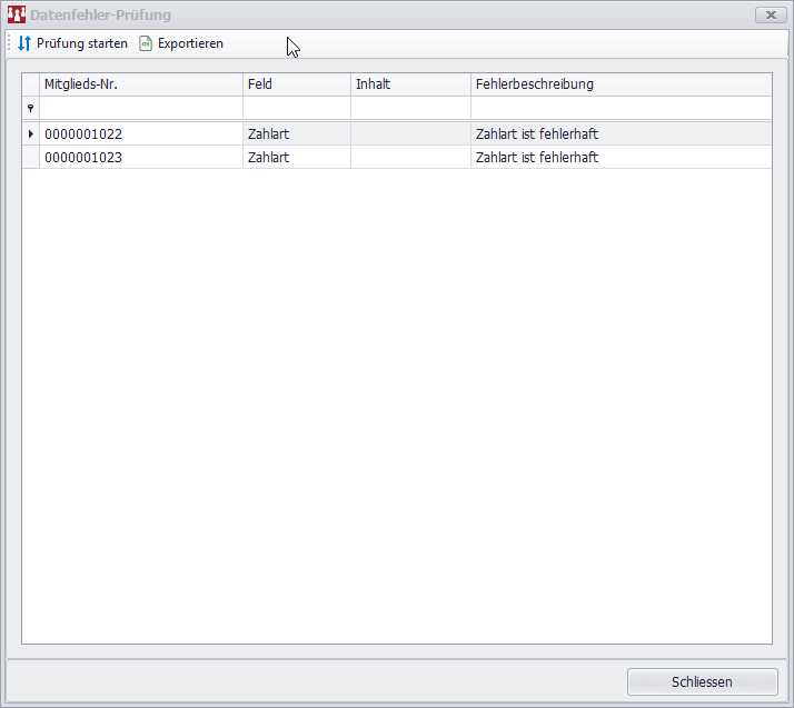 Als Resultat erhalten Sie nun die Fehler mit einer Fehlerbeschreibung, dem Feld und der Mitglieds-Nr. ausgegeben, in dem Sie die Information korrigieren können.