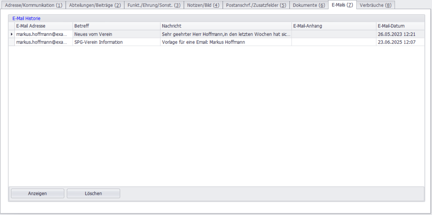 In dieser Registerkarte werden alle E-Mails angezeigt, die über den Menüpunkt Mitglieder > E-Mail-Versand versendet wurden. Sie können hier den Versandverlauf nachvollziehen, E-Mails einsehen und bei Bedarf Anhänge öffnen oder Einträge löschen.