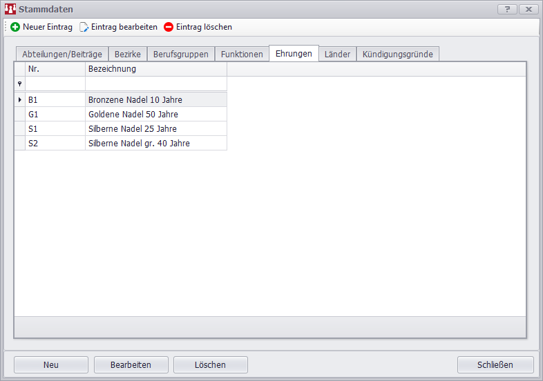 In dieser Maske werden mögliche Ehrungen, wie Auszeichnungen oder Nadeln, mit den jeweiligen Kürzeln und Bezeichnungen erfasst. Sie dienen der Dokumentation und späteren Auswertung von vergebenen Ehrungen.