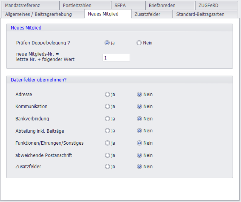 Zusätzlich haben Sie die Möglichkeit, das Intervall für die automatische Vergabe der nächsten Mitgliedsnummern festzulegen und Datenfelder aus vorherigen Eingaben automatisch zu übernehmen (z.B. wenn Sie mehrere Mitglieder derselben Abteilung zuordnen möchten).