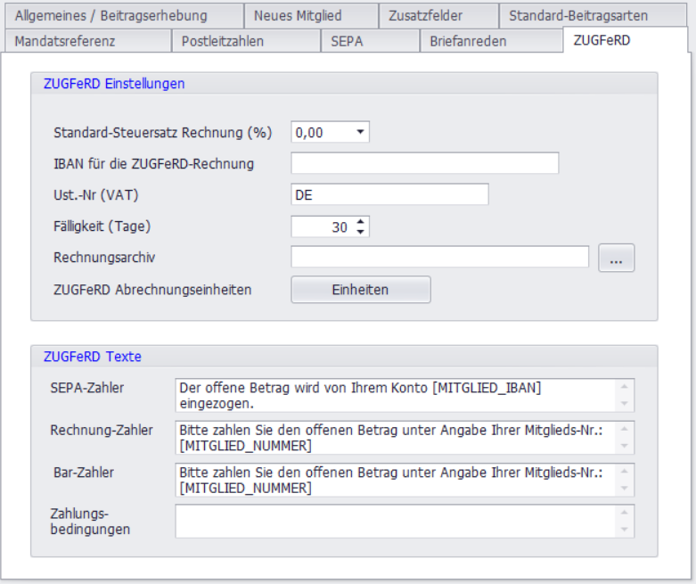 Hier können Sie Parameter für Ihre E-Rechnungen konfigurieren. Siehe auch E-Rechnungen mit SPG-Verein
