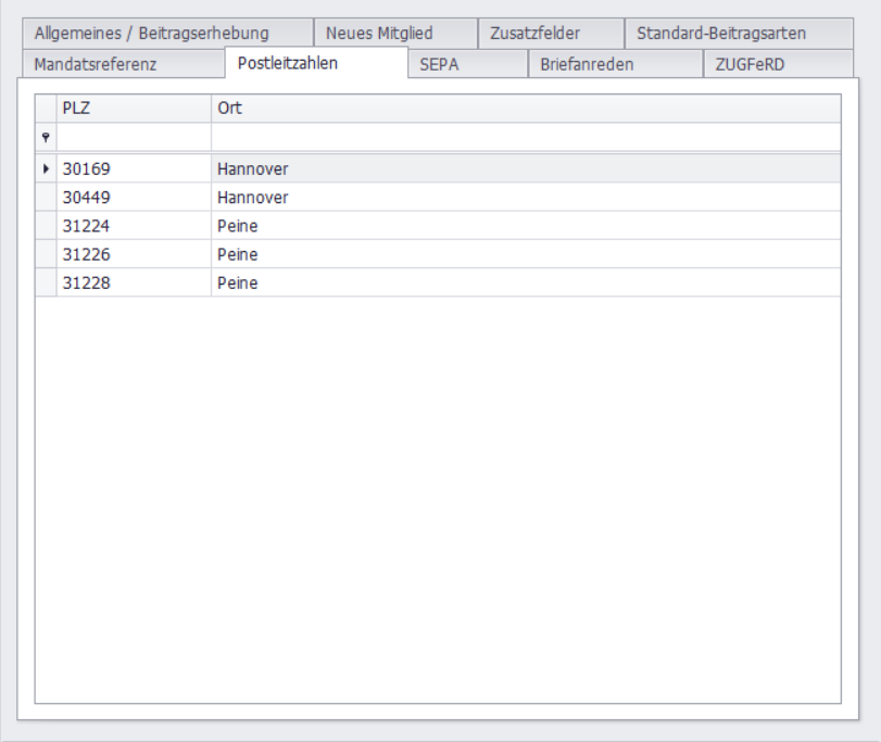 Hier können Sie gespeicherte Postleitzahlen bearbeiten oder über die obere Zeile hinzufügen.