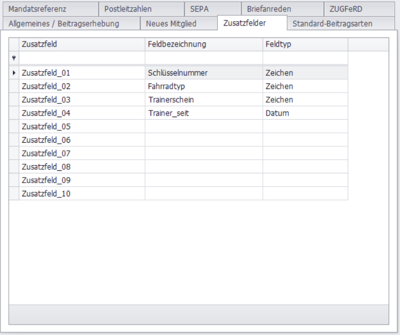 Es besteht die Möglichkeit, Zusatzfelder vorzugeben, die beim Mitglied auf der 5. Registerkarte dargestellt werden. Auf diese Weise können Sie SPG-Verein individuell auf Ihren Verein anpassen. Ihnen stehen 10 individuell verwendbare Zusatzfelder zur Verfügung: