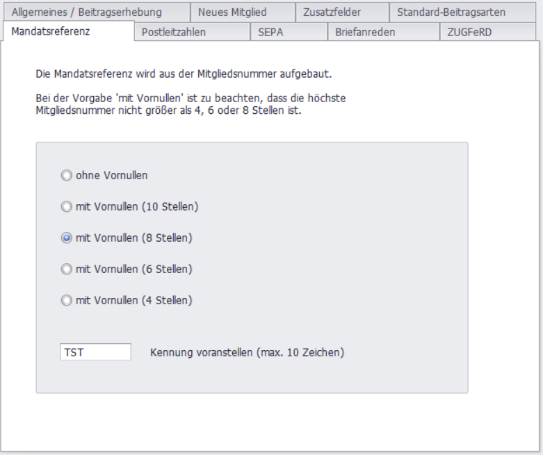 Hier kann eine Syntax vorgegeben werden, nach der die Mandatsreferenz gebildet werden soll. Sie können die Anzahl der Nullen individuell anpassen: