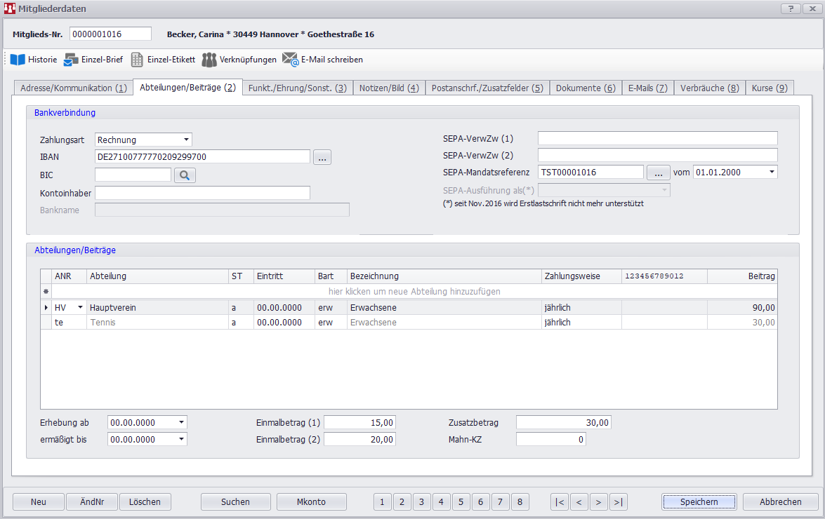 Einmal- und Zusatzbeträge können beispielsweise verwendet werden, wenn Mitglieder unterjährlich eintreten und nur einen Teil des Jahresbeitrags zu zahlen haben. Weiterhin ermöglichen die Felder, individuelle Beiträge auf Mitgliederebene, außerhalb der Abteilungen zu erheben.