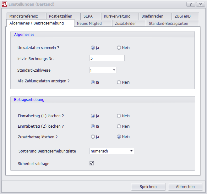 Sortierung Beitragserhebungsliste | Bestimmen Sie, ob die Beitragserhebungsliste nach "alphabetisch" (Nachname) oder "numerisch" (Mitglieds-Nr.) angezeigt werden soll. Die Sortierung kann auch nachträglich geändert werden. |