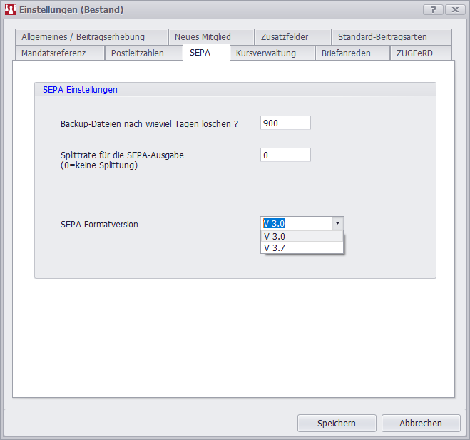 SEPA-Formatversion | Hier legen Sie fest, in welcher Version SPG-Verein die Lastschriftdatei erstellen soll. |