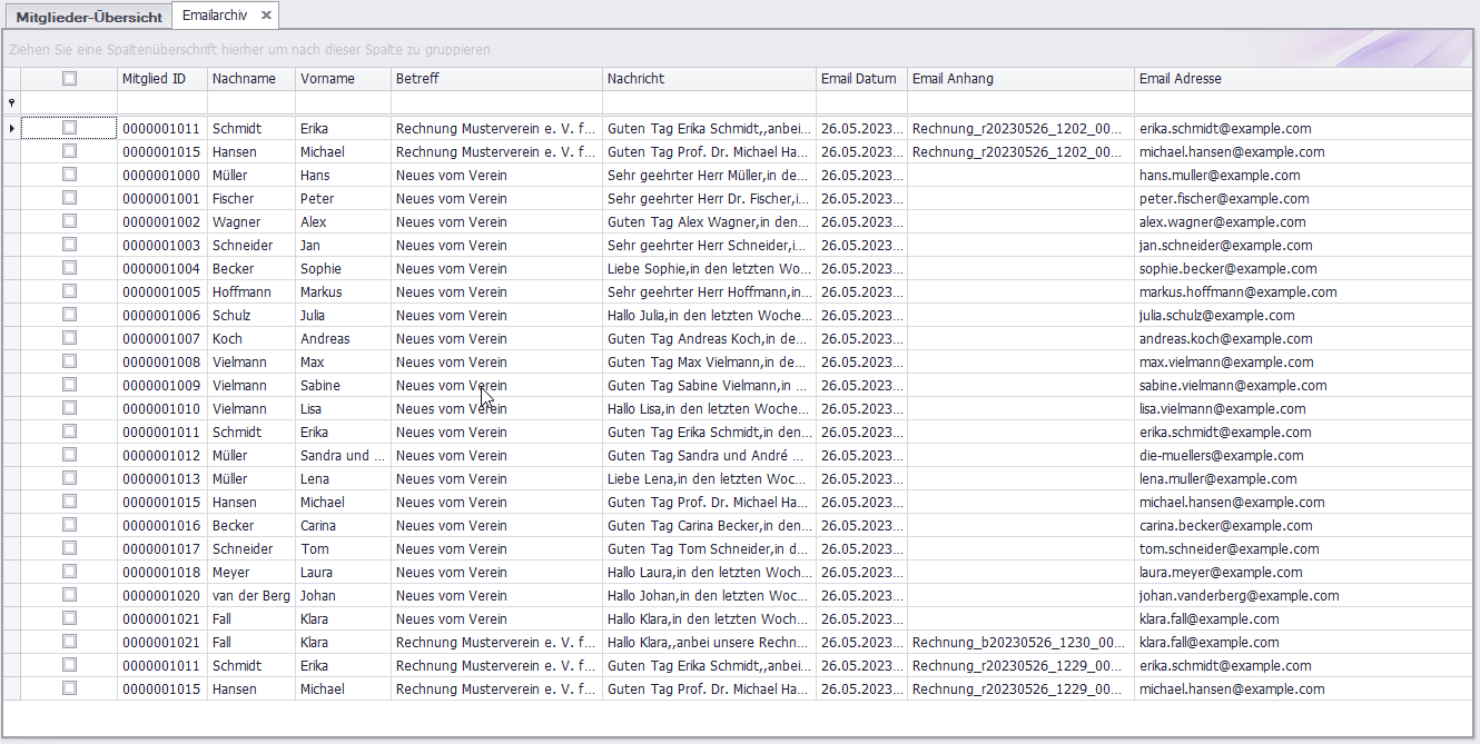 Zusätzlich zur E-Mail-Historie werden die versendeten Dokumente, wie z.B. Rechnungen oder Einladungen, im Dokumentenarchiv des jeweiligen Mitglieds abgelegt.