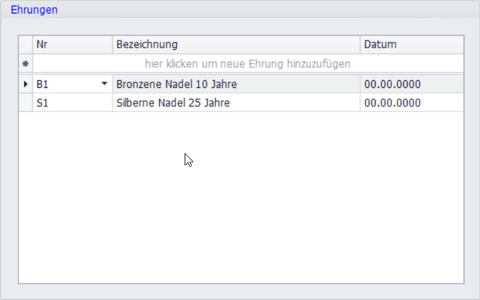 Ehrungen werden analog zu den Funktionen gepflegt: Über die Zeile für neue Ehrung wählen Sie aus den in den Stammdaten angelegten Ehrungen.