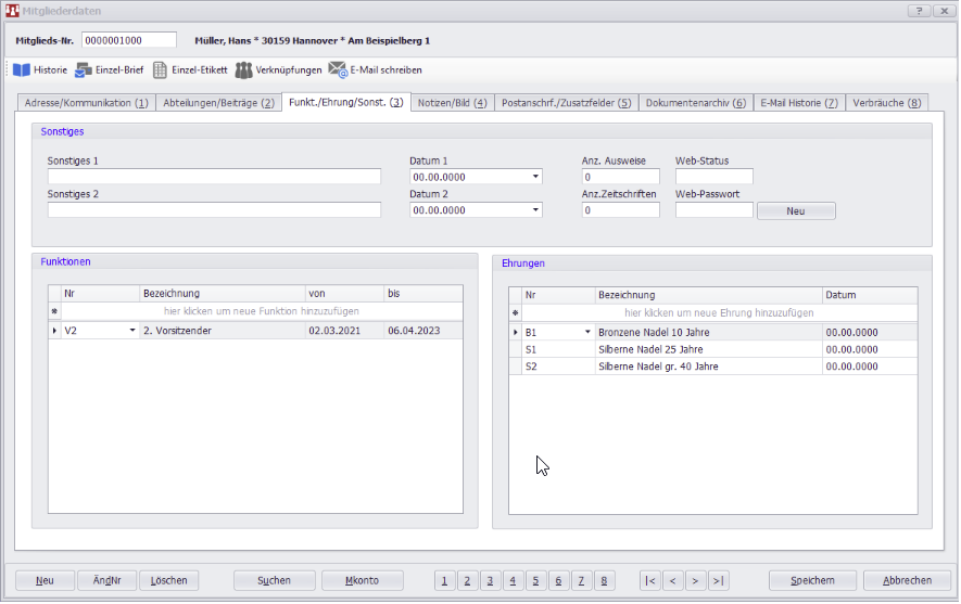 Öffnen Sie einen Mitgliederdatensatz und wechseln Sie auf die Registerkarte Funktionen/Ehrungen/Sonstiges. Folgende Felder stehen Ihnen zur Verfügung:
