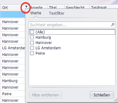Ein Klick auf das kleine Filtersymbol einer Spalte öffnet zwei Reiter: