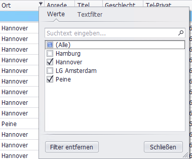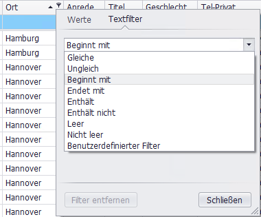 Textfilter: z. B. „Beginnt mit“ wählen und Text eingeben.Filter entfernen: Haken deaktivieren bzw. über den Button "Filter entfernen". Werte- als auch Textfilter werden entfernt.