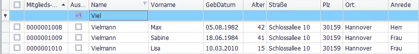 Tragen Sie direkt unter der Spaltenüberschrift einen Begriff ein. Beispiel: „Viel“ zeigt alle Mitglieder, deren Nachname mit „Viel“ beginnt.