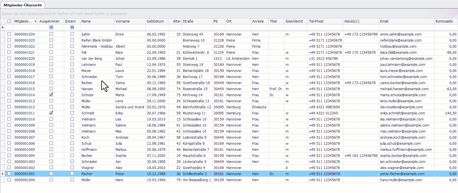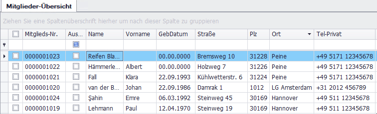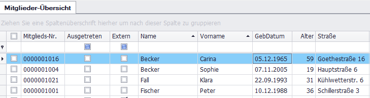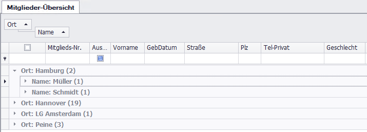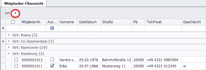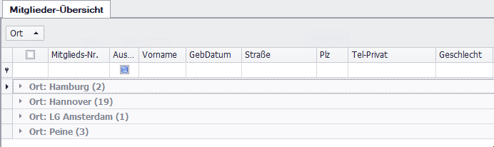 Ziehen Sie eine Spaltenüberschrift mit gedrückter linker Maustaste in den Bereich oberhalb der Übersicht, um nach dieser Spalte zu gruppieren. Beispiel: Ort → Mitglieder werden nach Orten gruppiert.