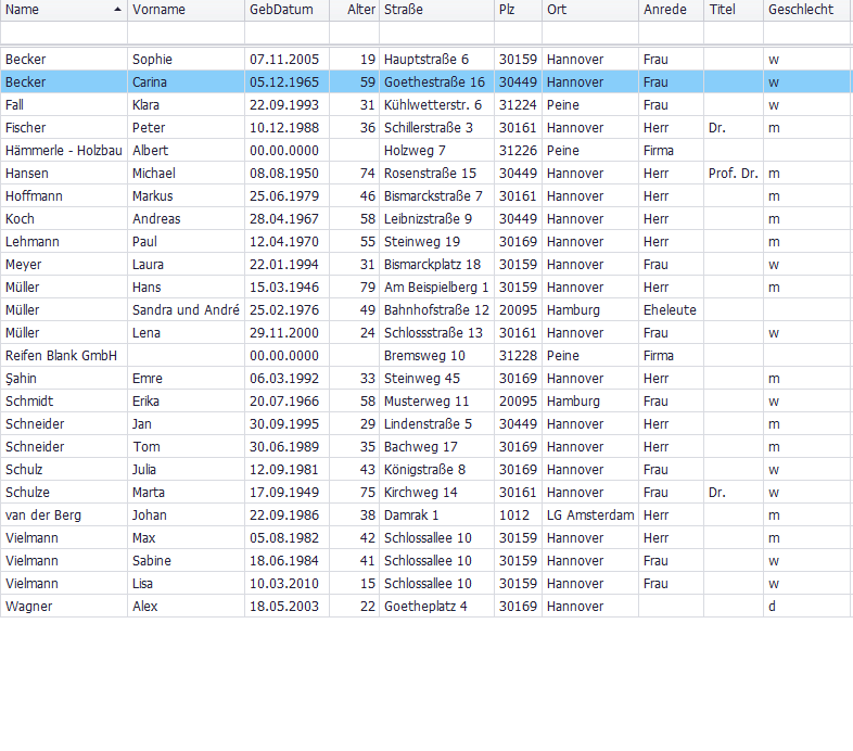 Nach dem Start ist die Mitglieder-Übersicht standardmäßig nach Name und Vorname sortiert. Sie können die Sortierung auf verschiedene Arten anpassen: