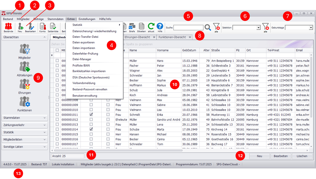 Menüleiste: Enthält die Hauptmenüpunkte zur Navigation durch die Programmfunktionen wie z. B. Stammdaten, Mitglieder, Übersichten oder Berichte. Manche Menüpunkte enthalten weitere Untermenüs, die Ihnen zusätzliche Optionen bieten.