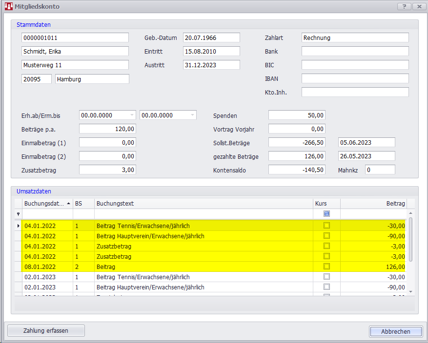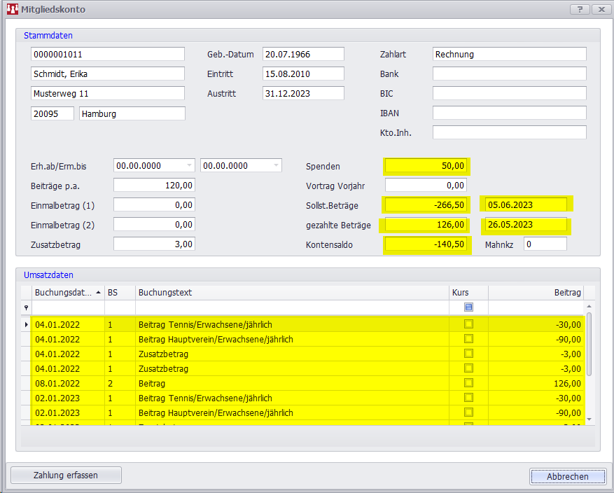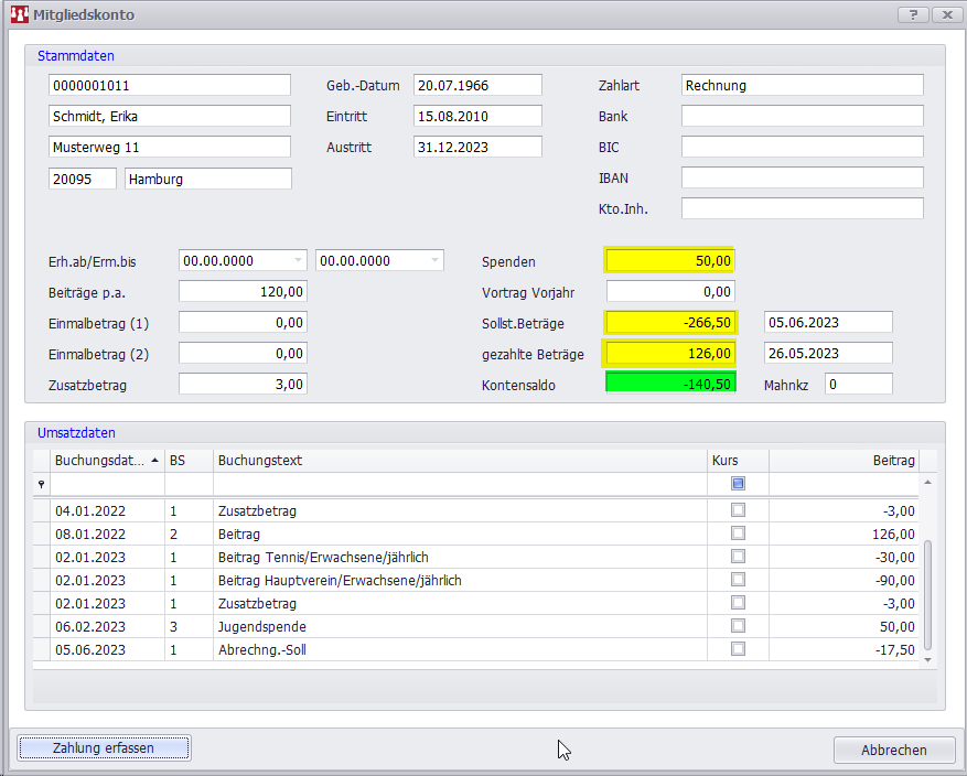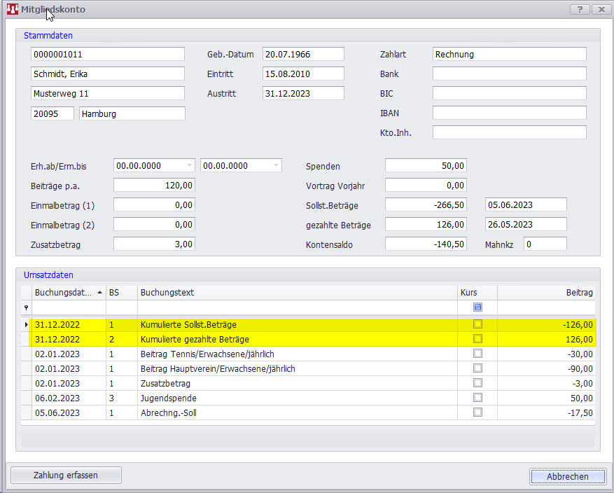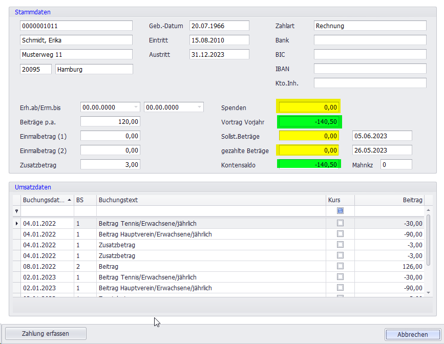 Sollte der offene Beitrag von 140,50€ gezahlt und als manuelle Zahlung erfasst werden, geht der Kontosaldo auf 0.-€, aber der Vortrag Vorjahr zeigt bis zum nächsten Jahresperiodenwechsel weiterhin zur Info den alten Betrag von -140,50€ an.